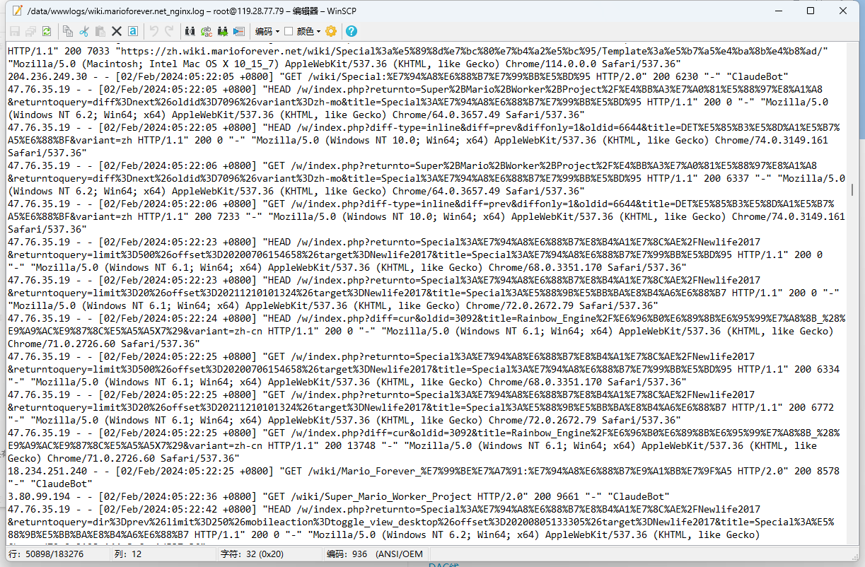 我服务器运行着 MF 社区 (Discuz)、MF Wiki (MediaWiki) 和 SMBX 社区 (Flarum) 这几个 PHP 程序,我发现 Wiki 的 nginx 访问日志大小比其他站都大,我就试图从 MediaWiki 本身找原因。我注意到,在日志中有许多搜索引擎爬虫在抓取一些很杂乱的、不是内容页面的 url,我参照 MediaWiki 官网的说明 给 robots.txt 添加了以下内容:
