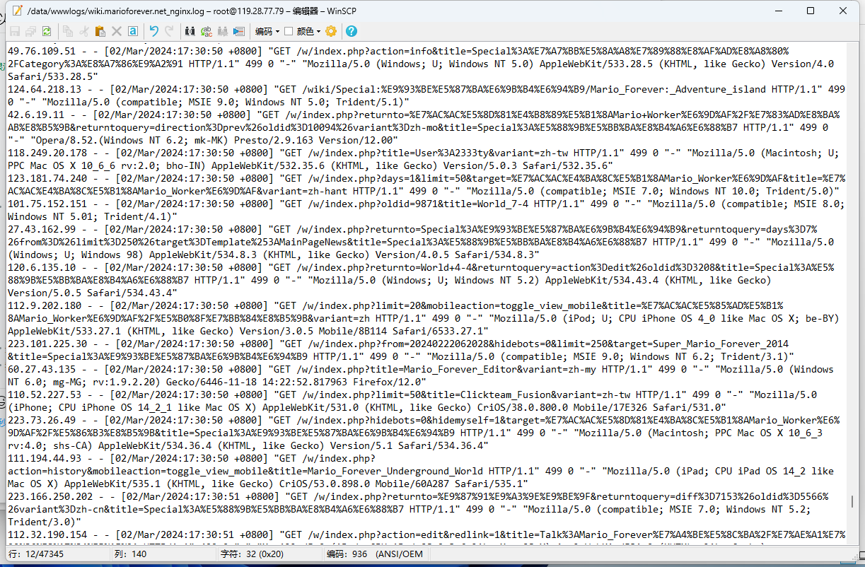 被拦截的包括老版本 Firefox/Chrome/IE/Opera、Win95/98/2000 和 64 位 XP(我想国内肯定没人用这类早该淘汰的操作系统访问 Wiki 吧)、Android 1~3、iOS 3/4(nginx 日志中这两个版本的 iOS 出现频率特别高)、32 位 Linux、PowerPC 版 OS X 及老版本的 Intel OS X。虽然有小概率误伤,但这个措施肯定是有效的。其实这类 ua 当中还有一种特征,就是浏览器语言很多都是小语种,而不是中英文,但我没有按语言进行屏蔽。