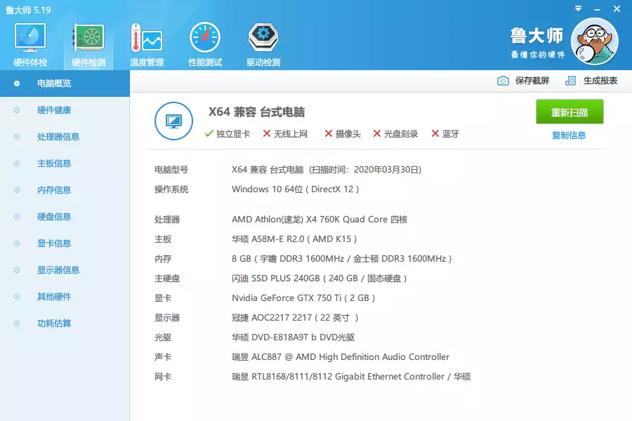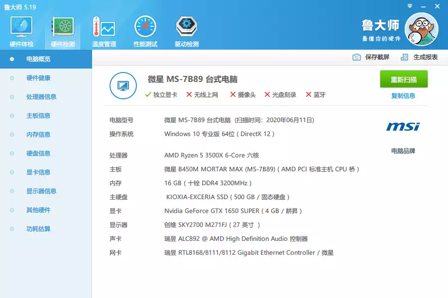 | 内存 | 十铨 8GB DDR4 3200MHz (双条) |